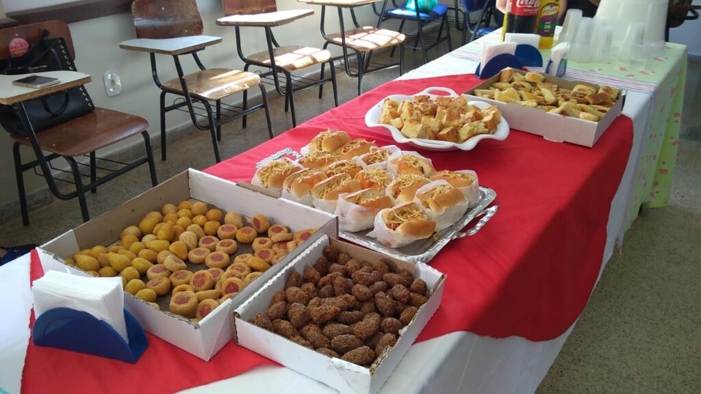 Durante a festa foi servido pipoca, cachorro quente, salgados feitos pela ex-assistida Renata Kelly, bolo, refrigerante, suco e uma farta mesa de doces para nossas crianças.